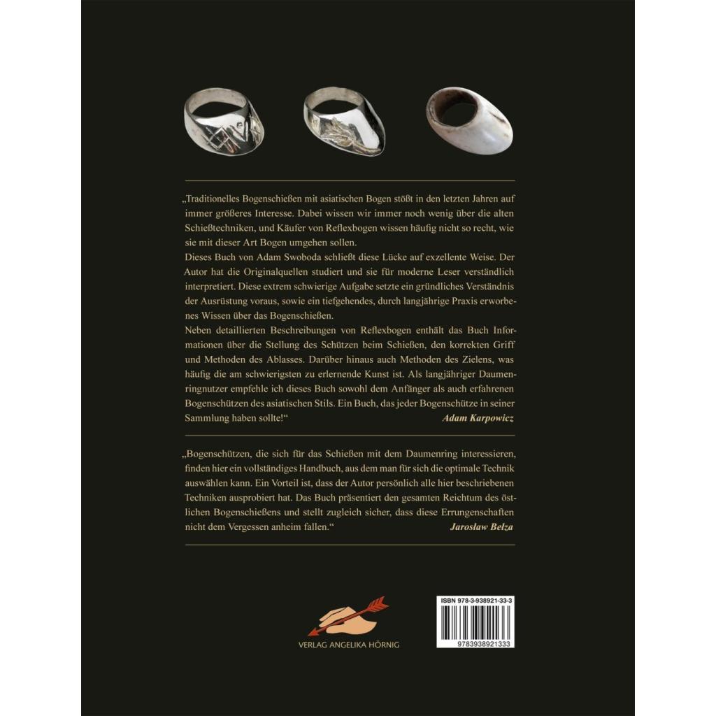 Traditionelles Bogenschießen mit asiatischen Bogen stößt in den letzten Jahren auf immer größeres Interesse. Dabei wissen wir immer noch wenig über die alten Schießtechniken, und Käufer von Reflexbogen wissen häufig nicht so recht, wie sie mit dieser Art Bogen umgehen sollen. Dieses Buch von Adam Swoboda schließt diese Lücke auf exzellente Weise. Der Autor hat die Originalquellen studiert und sie für moderne Leser verständlich interpretiert. Diese extrem schwierige Aufgabe setzte ein gründliches Verständnis der Ausrüstung voraus, sowie ein tiefgehendes, durch langjährige Praxis erworbenes Wissen über das Bogenschießen. Neben detaillierten Beschreibungen von Reflexbogen enthält das Buch Informationen über die Stellung des Schützen beim Schießen, den korrekten Griff und Methoden des Ablasses. Darüber hinaus auch Methoden des Zielens, was häufig die am schwierigsten zu erlernende Kunst ist. Ein Buch, das jeder Bogenschütze in seiner Sammlung haben sollte