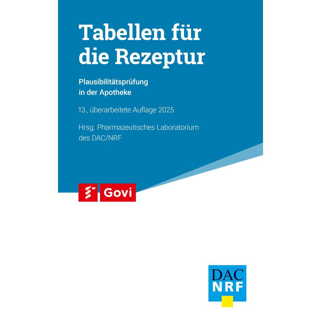 Gemäß ApBetrO Dieser Leitfaden unterstützt Sie bei der Plausibilitätsprüfung von Rezepturformeln, die nach der Apothekenbetriebsordnung vorgeschrieben ist. Die übersichtlichen Tabellen helfen, maßgeschneiderte Zubereitungen für den Patienten nach dem Therapiekonzept des Arztes zusammenzustellen. Die 'Tabellen für die Rezeptur' sind Teil des DAC/NRF. Das finden Sie in der aktuellen Ausgabe: - Checkliste zur Plausibilitätsprüfung - Checkliste für Prüfzertifikate - Bedenkliche Stoffe und Arzneimittel - Obere Richtkonzentrationen der Dermatikawirkstoffe und Normkonzentrationen für die Lokalanwendung - Wirkstoffprofile - Galenisches Profil und Verwendbarkeitsfristen standardisierter Grundlagen einschließlich Alkohol-Wasser-Gemische - Hydrogelbildner und Emulgatoren - Lipidzusätze zu Hautspiritus - pH-Korrigenzien - Konservierungsmittel - Empfehlung zur Festlegung der Aufbrauchfrist