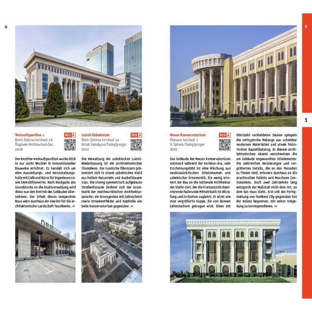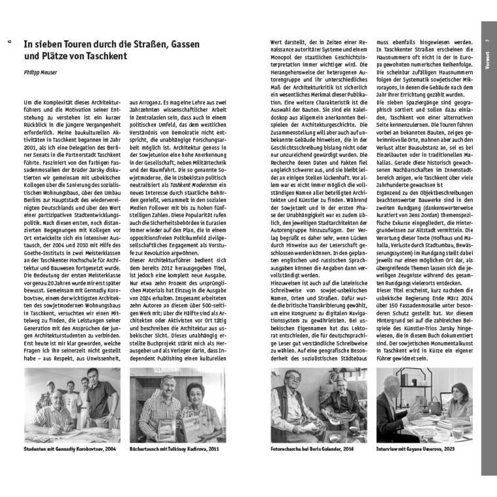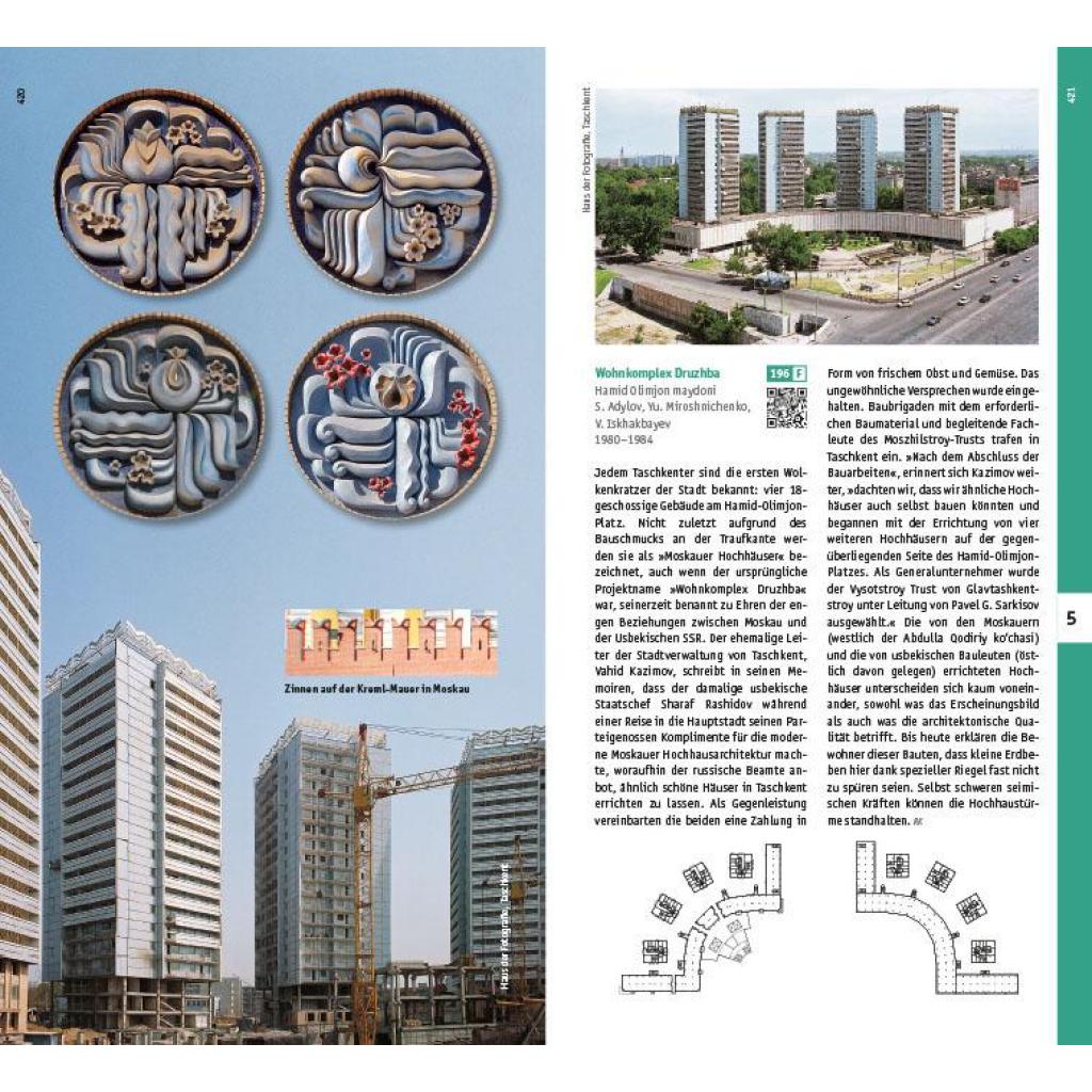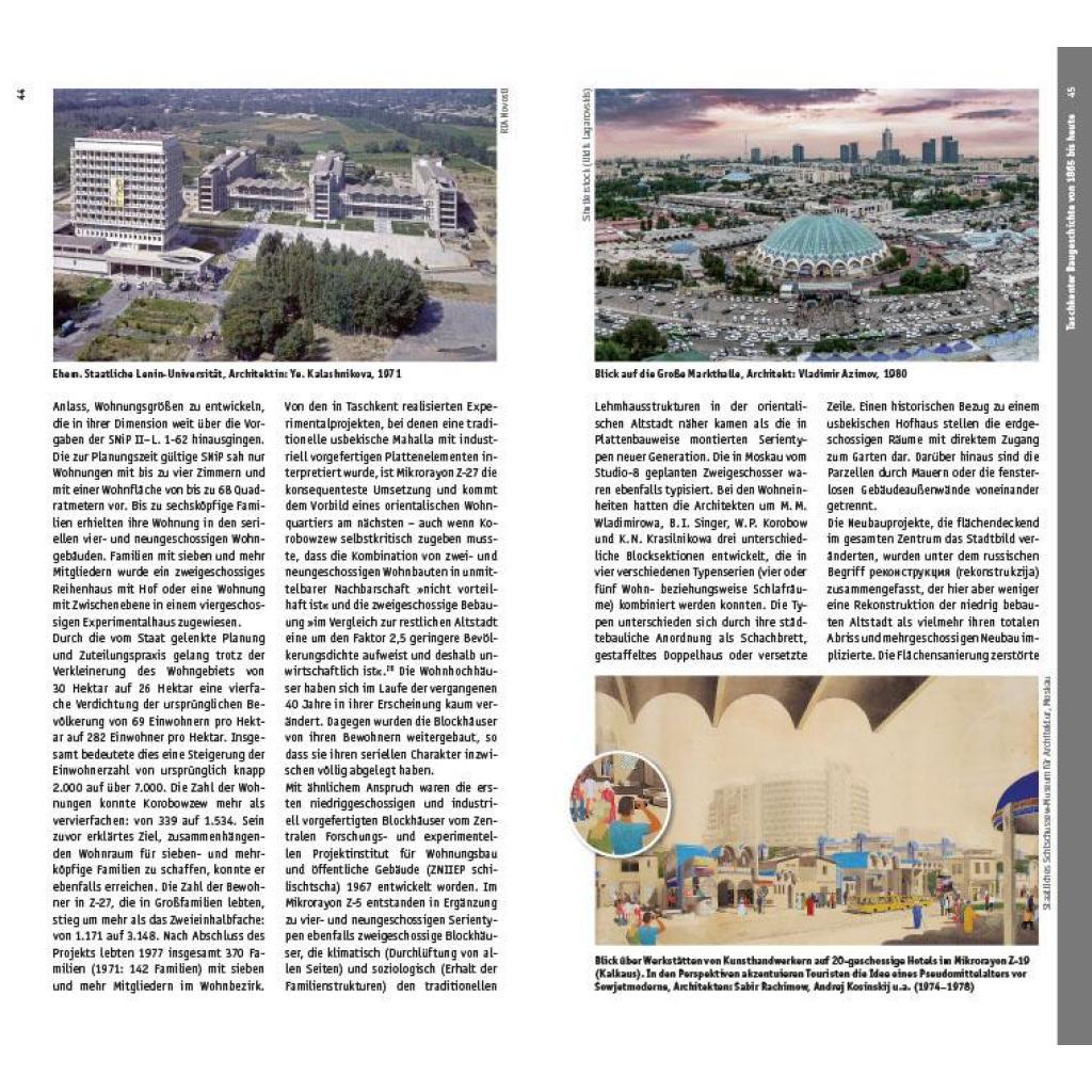 Taschkent hat sich seit der Isolierung Russlands durch die westliche Architekturszene zu einem Sammelplatz verschiedener Akteure entwickelt. Einerseits beherbergt die Hauptstadt Usbekistans russische Geflüchtete, andererseits kokettieren lokale Kulturschaffende nach wie vor mit der Politik Moskaus. Taschkent ist zu einem Ort geworden, den man durchaus mit Wien während des Kalten Kriegs vergleichen kann. In der Drei-Millionen-Metropole treffen aber auch mittelalterliche Bauten auf Sowjetmoderne und zeitgenössische Architektur. Historische Bauwerke wie die Altstadt mit ihren engen Gassen und traditionellen orientalischen Basaren kontrastieren mit riesigen Wolkenkratzern, großen Plätzen und monumentalen Regierungsgebäuden. Oft sind die Neubauten das Ergebnis von Verdrängung und Enteignung. Der umfangreiche Architekturführer Taschkent macht die reiche städtebauliche Vielfalt der größten Metropole in Zentralasien sichtbar. Dabei nimmt die Stadt in der sowjetischen Architekturgeschichte eine besondere Rolle ein. 1966 von einem Erdbeben heimgesucht, wurde sie in den Folgejahren radikal zu einer sowjetischen Musterstadt umgebaut - in die eine lokale Form- und Farbensprache einfloss. Seit der Unabhängigkeit Usbekistans 1991 erfolgte ein Bruch mit der sowjetischen Architektur und eine Veränderung des Stadtbildes als Zeichen der gesellschaftlichen Veränderungen. Diese Transformation mündete in einer autokratischen Regierungsform, die sich nach außen weltoffen zeigt, nach innen aber nach wie vor Andersdenkende marginalisiert oder gar verurteilt. In den vergangenen 30 Jahren entstand eine neo-usbekische Architektur, die lang nach ihrer eigenen Ausdrucksform gesucht hat. Heute überrascht die Millionenstadt mit einer ambitionierten, häufig nach Superlativen strebenden Architektur, die international noch wenig Beachtung findet. Philipp Meuser und neun weitere deutsche und usbekische Autoren stellen unterschiedliche Bauten aus einer 2.200 Jahre alten Stadtgeschichte vor, die auf sieben geographisch sortierten Routen zu 250 Bauten anschaulich erlebbar wird. Mit über 1.400 Abbildungen, Skizzen und Plänen bietet der Führer einen umfassenden Eindruck von der Bandbreite der Architektur Taschkents; gleichzeitig ist die Publikation mit ihren unterschiedlichen Beiträgen auch ein Kaleidoskop der gegenwärtigen Debatte über Architektur und Stadtentwicklung in Zentralasiens größter Metropole. Inhalt: + In sieben Touren durch die Straßen, Gassen und Plätze von Taschkent + Die Geschichte der Stadt Taschkent seit ihrer kolonialen Eroberung im Jahr 1865 + Im Süden der orientalischen Altstadt: Tashkent City, Nationalpark und Mahalla Chaqar + Im Nordwesten der orientalischen Altstadt: Beruniy, Chorsu und Klein-Venedig + Im Nordosten der orientalischen Altstadt: Navoiy-Straße, Sebzor und Navruz-Park + Entlang der Amir-Temur-Achse: Museen, Forum-Palast und Fernsehturm + Unterwegs in der kolonialen Neustadt: Regierungsbauten, Paläste und Kirchen + Zwischen Flughafen und kolonialer Neustadt: Feuertempel, Kulturpaläste und Experimentalbauten + Unterwegs in Chilonzor: Versuchslabor des sowjetischen Wohnungsbaus