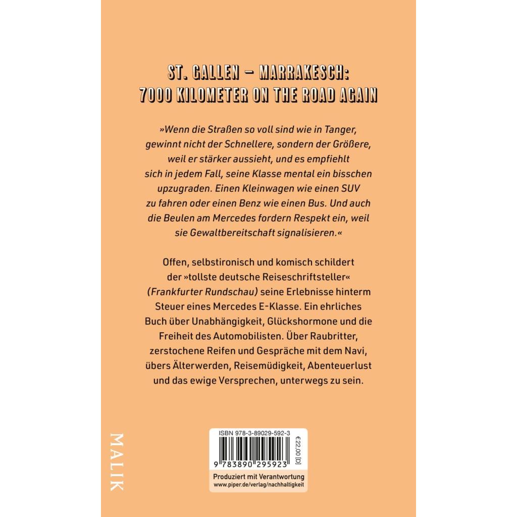 | Keyword: | Altern; Autoreise; Barcelona; Bestsellerautor; Biografie; Brenner; Costa del Azahar; Daimler Benz; Genua; Granada; Hippie; Hormone; Hotel; Italien; Journalismus; Lebenserfahrung; Limousine; Malaga; Marokko; Marrakesch; Memoiren; Mercedes; Mercedes Benz; Polizei; Reisebericht; Reisebericht Frankreich; Reisebericht Italien; Reisebericht Marokko; Reisebericht Spanien; Reisen; Reisereportage; Reiseschriftsteller; Road trip; Roadmovie; Selbsterfahrung; Spanien; St. Gallen; Testosteron; Valencia; allein Reisen; moderner Nomade; Überfall; älter werden |