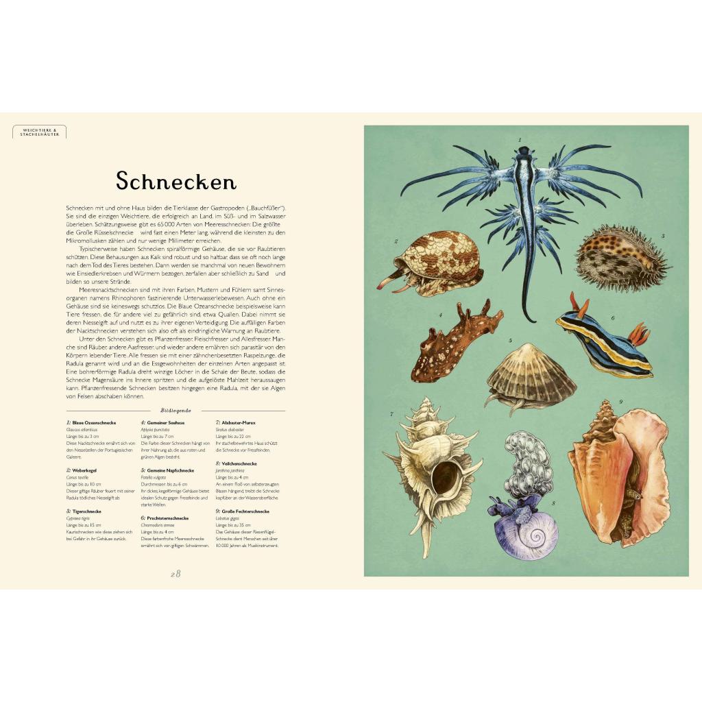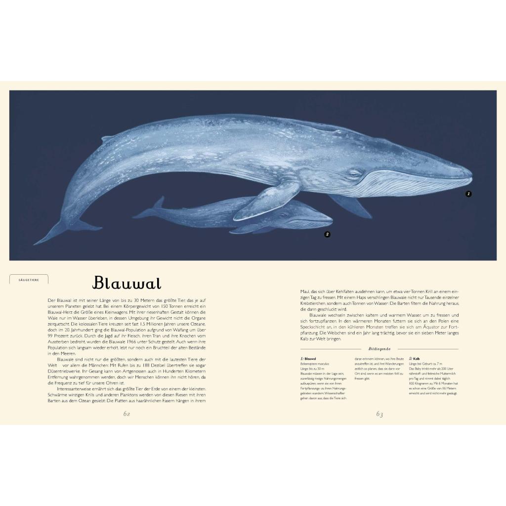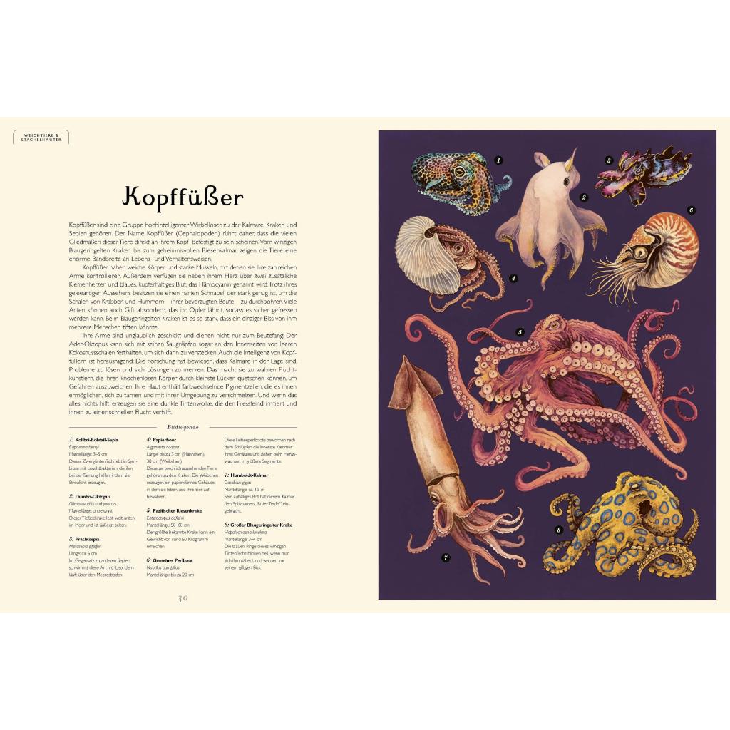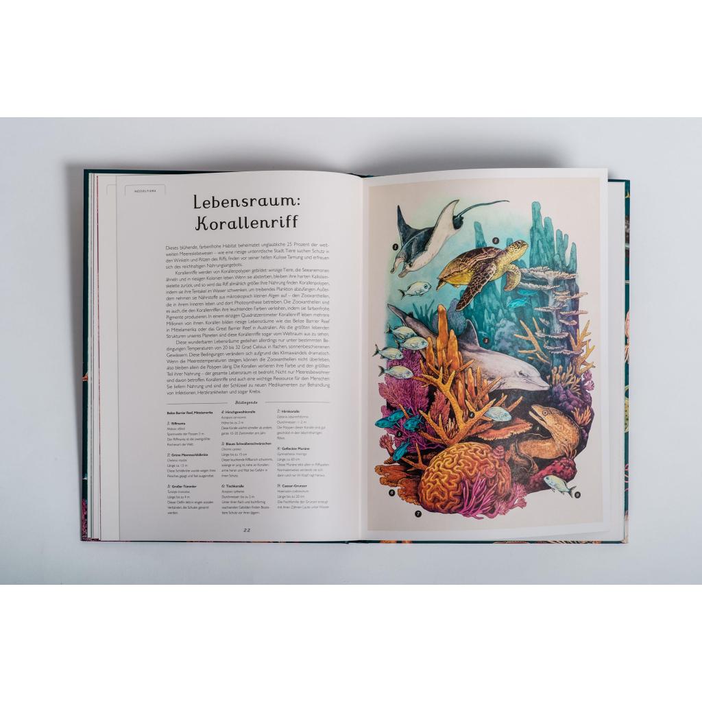 Die größte Ausstellung der Erde öffnet ihre Pforten! Tauche ein in die Unterwasserwelt unserer größten und wertvollsten Lebensräume: der Ozeane! 71 Prozent der Erdoberfläche sind von Meeren bedeckt. Tritt ein und entdecke, was und wer hier lebt: Erkunde die verschiedenen Ökosysteme des Arktischen, Atlantischen, Indischen, Pazifischen und Südlichen Ozeans! Dieses Museum zeigt uns die Schönheit der Weltmeere mit allen ihren Bewohnern, begleitet von informativen Sachtexten der Meeresbiologin Loveday Trinick. Auf großformatigen Tableaus mit liebevoll und detailgetreu gezeichneten Gouache- und Aquarellmalereien der Illustratorin Teagan White sind - wie in einem Aquarium - Korallen, Quallen, Rochen, Schildkröten, Delfine, Wale und vieles mehr zu sehen. Jedes Kapitel befasst sich mit einer Gattung oder einem Lebensraum wie Nesseltiere, Säugetiere, Fische oder Korallenriffe. Der Band der "Eintritt frei"-Reihe fasziniert mit wunderschönen Einblicken in Lebensräume, die uns sonst verborgen bleiben. Dieses Buch wird klimaneutral produziert. Ausstattung: 37 Farbtafeln; mit Goldfolienprägung auf dem Cover, 37 Farbtafeln