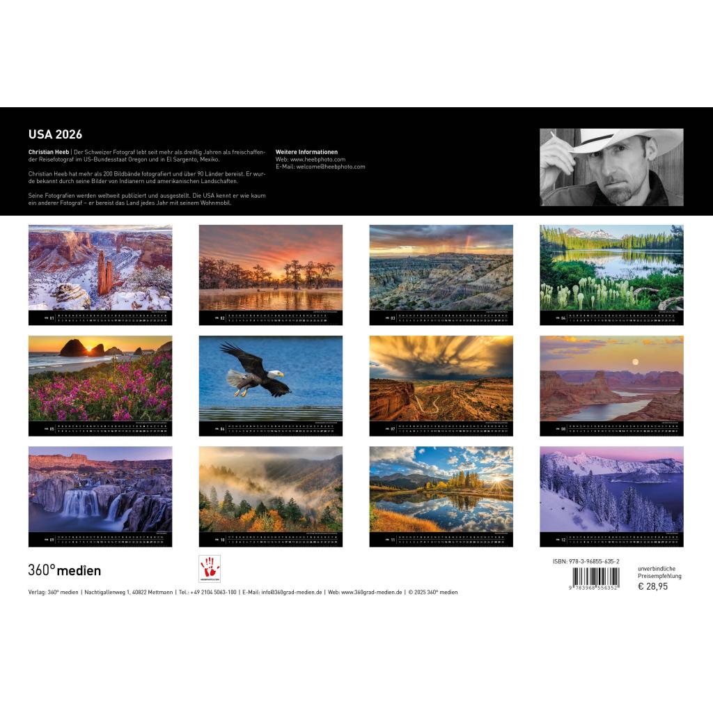 Aus traumhaften USA-Aufnahmen des Fotografen Christian Heeb hat die Redaktion von 360° medien die 13 schönsten Motive ausgewählt und in diesem Kalender zusammen gestellt. Präsentiert werden die Fotos auf hochwertigem Papier im Format 50 cm x 35 cm.