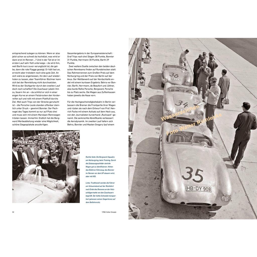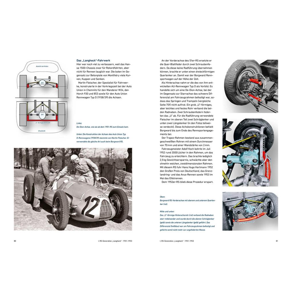 Die Isabella und der kleine Lloyd gehören zu den bekanntesten Autos der 50er- und 60er-Jahre. Der Bremer Automobilhersteller Borgward baute nicht nur elegante Limousinen und sparsame Kleinwagen, sondern auch Rennwagen. Seit 1950 beteiligte sich das Bremer Werk am internationalen Motorsport. Im August 1950 erregten Rekordfahrten auf der Bahn von Montlhéry bei Paris Aufsehen. Die Fahrt ging über 5000 Meilen und dauerte mehr als 48 Stunden. Der stromlinienförmige Borgward stellte dabei 12 Strecken- und Zeitrekorde auf. Die Höchstgeschwindigkeit betrug 196 km/h. 1952 fuhren die Bremer erste Siege gegen internationale Konkurrenz ein. Die Leistung lag damals bei 80 PS. Bis 1959 steigerte der Borgward Motorenkonstrukteur Karl-Ludwig Brandt sie auf annähernd 160 PS, was für eine Geschwindigkeit von 270 km/h ausreichte. 1953 fuhr Borgwards Werksfahrer Hans Hugo Hartmann das härteste Rennen der Welt mit. Die Carrera Panamericana zog sich über 3000 Kilometer durch Mexiko. Hartmann führte in der Sportwagenklasse bis 1,5-Liter-Hubraum. Doch 200 km vor dem Ziel brach eine Ventilfeder. Mit erheblich geringerer Motorleistung schleppte er sich zum Zielort. Sein Vorsprung von mehr als 1 ¿ Stunden gegenüber dem nächsten Konkurrenten sollte ihm den Sieg sichern. Aber er überschritt das vorgeschriebene Zeitlimit der letzten Etappe um 7 Sekunden. Disqualifikation! Alle großen Zeitungen der Welt berichteten über Pechvogel Hartmann. Der Presserummel war für die Borgward-Werke ein Segen. Der Bekanntheitsgrad stieg immens. Ab Mitte der 50er-Jahre entwickelten sich die Veranstaltungen immer stärker zu einem Konkurrenzkampf zwischen Porsche und Borgward. Das gipfelte 1958 im Avus-Rennen, als nach 40 Runden (332 km) und 1 Stunde 36 Minuten Porsche mit einem Vorsprung von 0,8 Sekunden (!) gewann. Der Sportwagenhersteller Porsche konnte es nicht zulassen, auf den zweiten Platz abgeschoben zu werden. Das wäre dem Image abträglich gewesen. Die Stuttgarter hätten jede Summe investiert, um es nicht so weit kommen zulassen. Da konnte Borgward nicht mithalten. Außerdem vermutete Carl F. W. Borgward, dass die Werbewirkung gewonnener Rennen wesentlich geringere Auswirkungen auf das Pkw-Geschäft besaß als angenommen. Er gab den Rennsport auf. Der zweite Teil des Buchs widmet sich der Technik. Ausführlich werden die fünf unterschiedlichen Motoren vorgestellt. Anhand von Fotos und Zeichnungen erklärt der Autor die Schwächen und Stärken der Achskonstruktionen und die Windschnittigkeit der im Windkanal getesteten Karosserien. Ein kleines Kapitel über den Verbleib der Borgward-RS-Wagen, Rennlisten und Tabellen der technischen Daten der Fahrzeuge sowie der Motoren schließen das Buch ab.