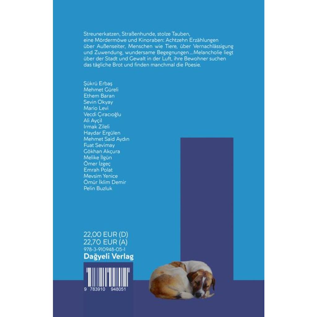 Streunerkatzen, Straßenhunde, stolze Tauben, eine Mördermöwe und Kinoraben: Achtzehn Erzählungen über Außenseiter, Menschen wie Tiere, über Vernachlässigung und Zuwendung, wundersame Begegnungen ... Melancholie liegt über der Stadt und Gewalt in der Luft, ihre Bewohner suchen das tägliche Brot und finden manchmal die Poesie. Mit Beiträgen von: ¿ükru Erbä, Mehmed Güreli, Ethem Baran, Sevin Okyay, Mario Levi, Vecdi Ç¿rac¿ölu, Ali Ayçil, Irmak Zileli, Haydar Ergülen, Mehmet Said Ay- d¿n, Fuat Sevimay, Gökhan Akçura, Melike ¿lgün, Ömer ¿zgeç, Emrah Polat, Mevsim Yenice, Ömür ¿klim Demir, Pelin Buzluk