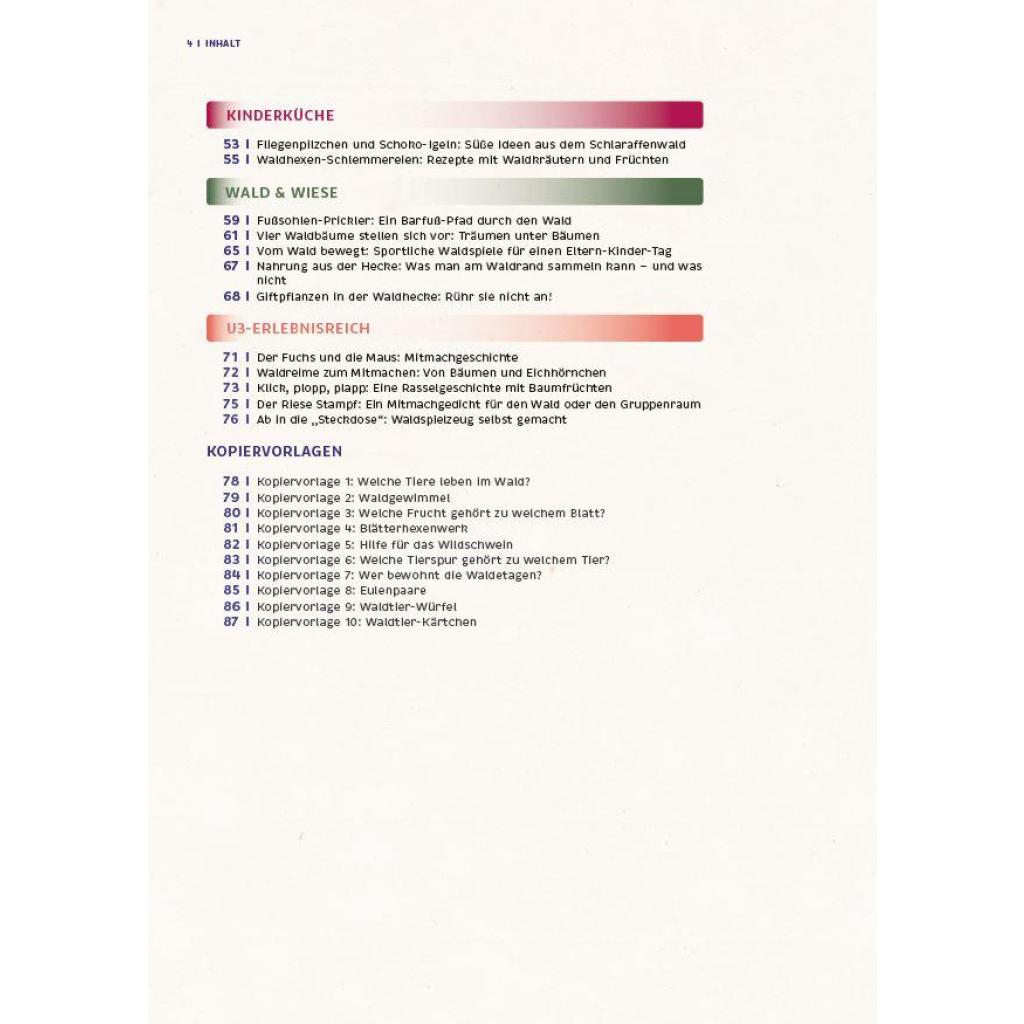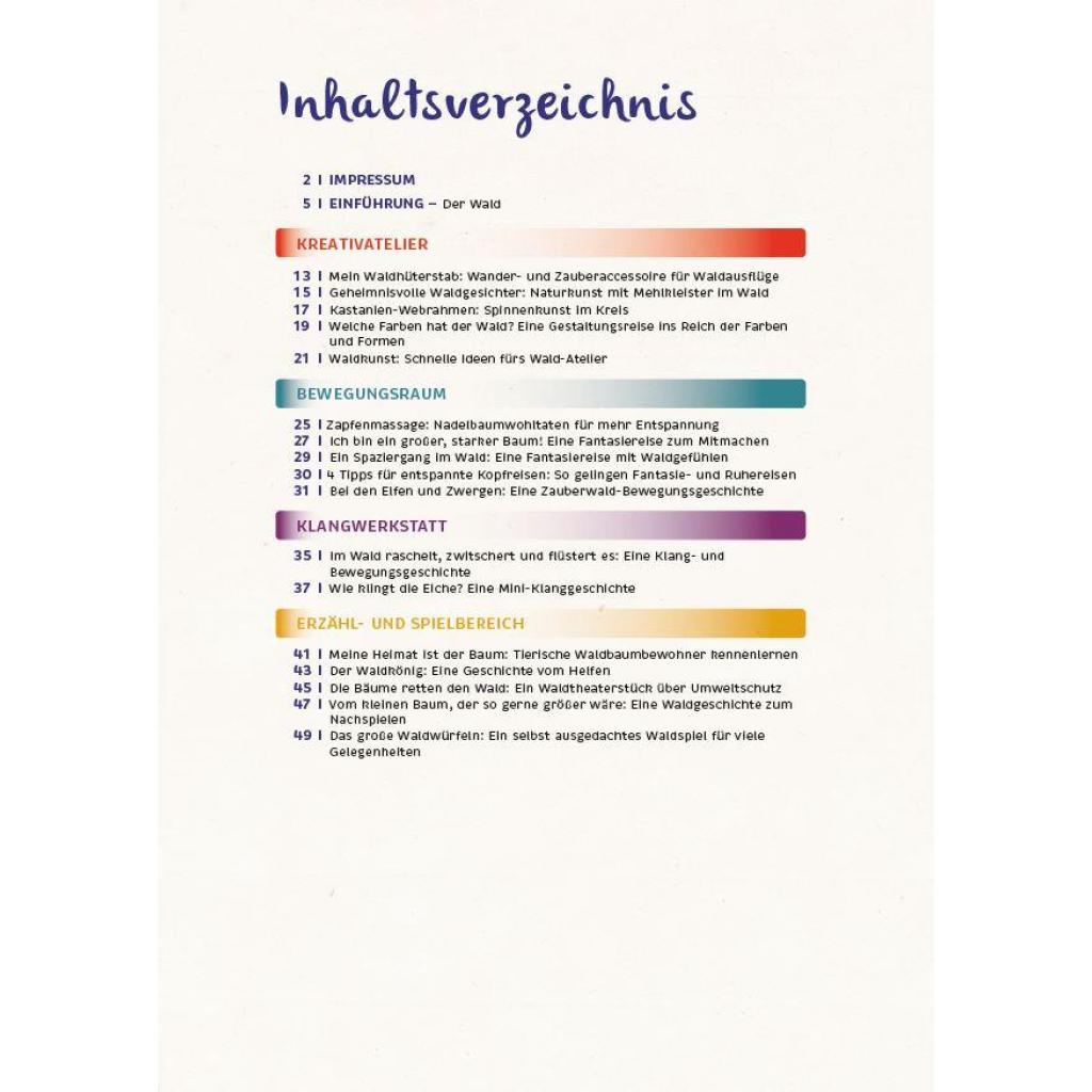 Der Wald ist ein faszinierender Ort voller Abenteuer für Kinder - dieses Praxisbuch ist die Eintrittskarte in diese Welt! Es hat 44 spannende Projektideen für die Kita und den Wald im Gepäck: Von Kreativideen mit Naturmaterialien über Zauberwald-Fantasiereisen bis zu leckeren Rezeptideen - mit allen Sinnen erleben die Kinder den Wald. Sie lernen heimische Baumarten und ihre Blätter kennen, gehen den Waldtieren auf die Spur und lauschen den Waldgeräuschen bei einer Klanggeschichte. Ob Ausflug, Waldtag oder ein ganzes Waldprojekt: Mit dieser Ideensammlung sind Sie perfekt ausgerüstet, um mit den Kindern die kleinen und großen Geheimnisse des Waldes zu entdecken!