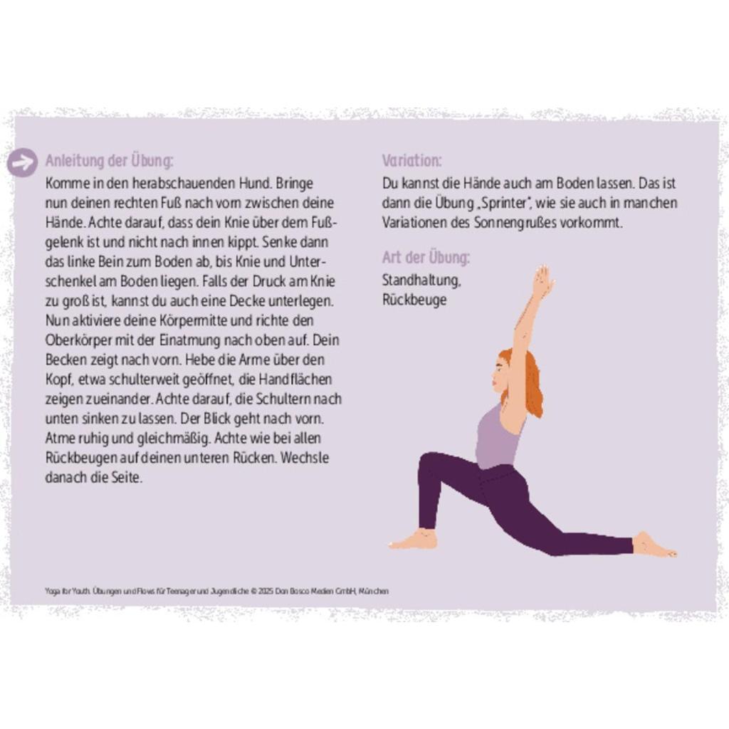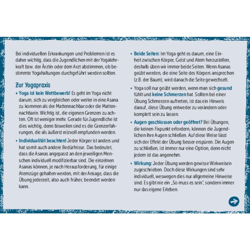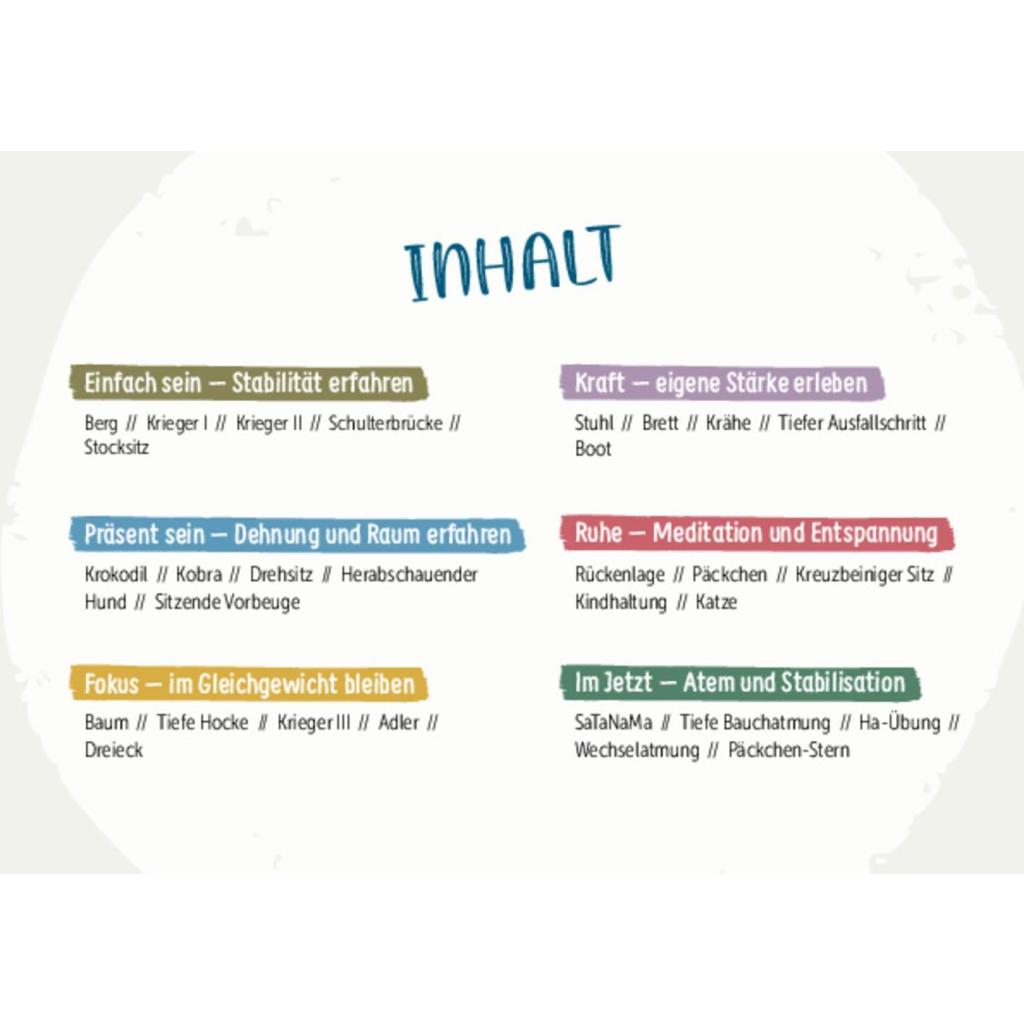 | Keyword: | asanas; atemübungen zur entspannung; emotionen regulieren übungen; konzentration fördern; körperwahrnehmungsübungen; resilienz stärken; selbstwirksamkeit übungen; sport für jugendliche; stress abbauen; teenager yoga; yoga bildkarten; yoga for teenager; yoga mit jugendlichen; yoga übungskarten; yogakarten |