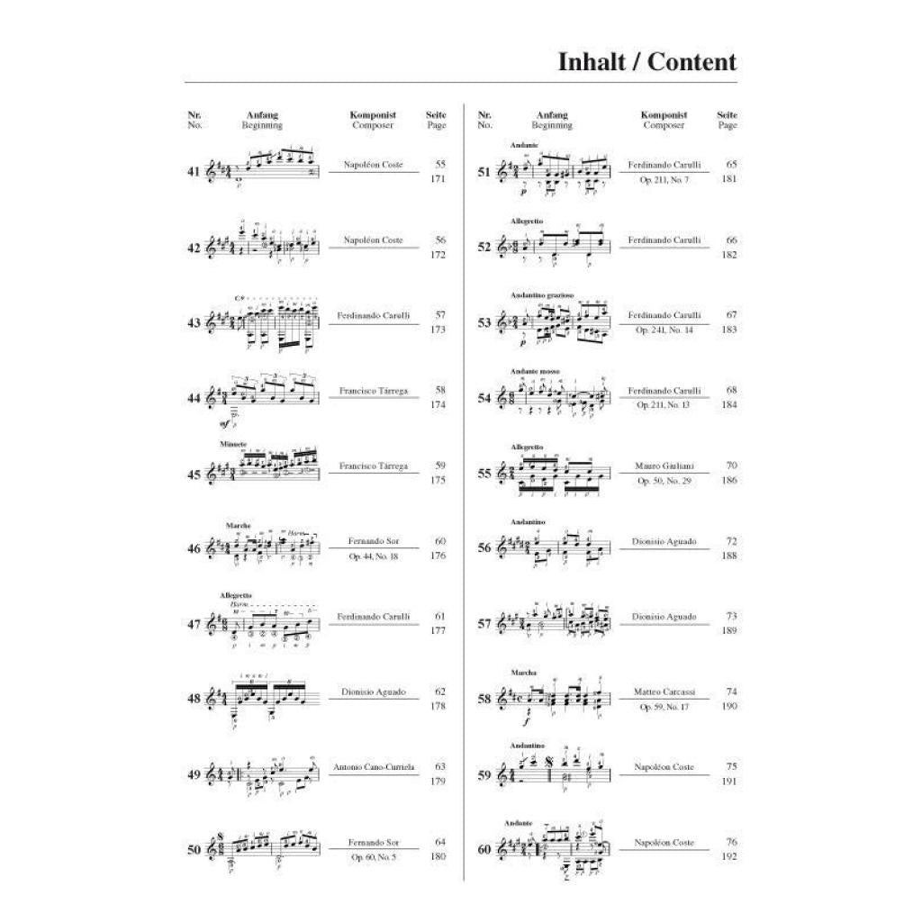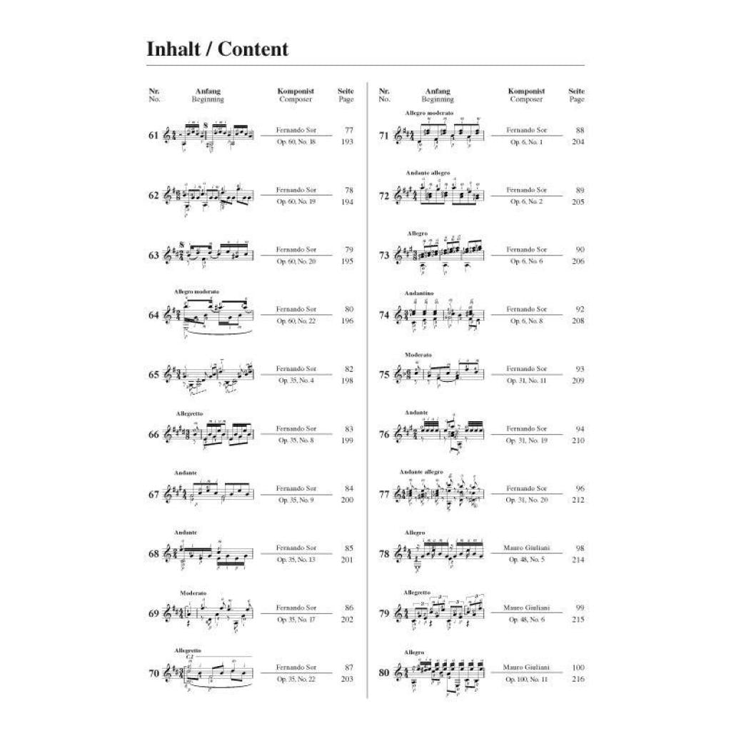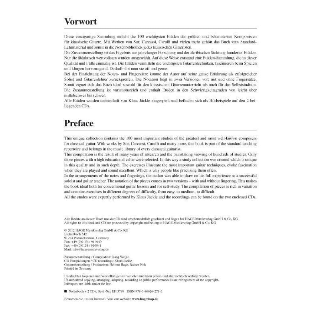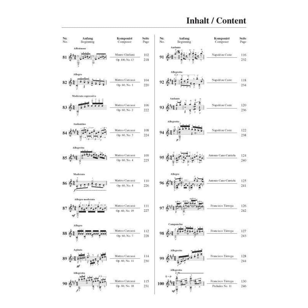 Diese einzigartige Sammlung enthält die 100 wichtigsten Etüden der größten und bekanntesten Komponisten für klassische Gitarre. Mit Werken von Sor, Carcassi, Carulli und vielen mehr gehört das Buch zum Standard-Lehrmaterial und somit in die Notenbibliothek jedes klassischen Gitarristen. Die Zusammenstellung ist das Ergebnis aus jahrelanger Forschung und der akribischen Sichtung hunderter Etüden. Nur die didaktisch wertvollsten wurden ausgewählt. Auf diese Weise entstand eine Etüden-Sammlung, die in dieser Qualität und Fülle einmalig ist. Die Etüden vermitteln die wichtigsten Gitarrentechniken, faszinieren beim Spielen und klingen hervorragend. Deshalb übt man sie oft und gerne. Bei der Einrichtung der Noten- und Fingersätze konnte der Autor auf seine ganze Erfahrung als erfolgreicher Solist und Gitarrenlehrer zurückgreifen. Die Notation liegt in zwei Versionen vor: mit und ohne Fingersätze. Somit eignet sich das Buch ideal sowohl für den klassischen Gitarrenunterricht als auch für das Selbststudium. Die Zusammenstellung ist variationsreich und enthält Etüden in den Schwierigkeitsgraden von leicht über mittelschwer bis schwer. Alle 100 Etüden wurden meisterhaft von Klaus Jäckle eingespielt und können als Hörbeispiel über den jeweiligen QR-Code einfach mit dem Smartphone oder Tablet abgespielt werden. --------------------------- This unique collection contains the 100 most important studies of the greatest and most well-known composers for classical guitar. With works by Sor, Carcassi, Carulli and many more, this book is part of the standard teaching repertoire and belongs in the music library of every classical guitarist. This compilation is the result of many years of research and the painstaking viewing of hundreds of studies. Only those pieces with a high educational value were selected. In this way a study collection was created which is unique in this quality and in such depth. The exercises illustrate the most important guitar techniques, evoke fascination when they are played and sound excellent. Which is why people like practising them often. In the arrangements of the notes and fingerings, the author was able to draw on his full experience as a successful soloist and guitar teacher. The notation of the pieces comes in two versions - with and without fingering. This makes the book ideal both for conventional guitar lessons and for self-study. The compilation of pieces is rich in variation and contains exercises in different degrees of difficulty, from easy, to medium, to difficult. All 100 etudes were expertly performed by Klaus Jäckle and can be easily played as an audio sample with a smartphone or tablet via the corresponding QR code.
