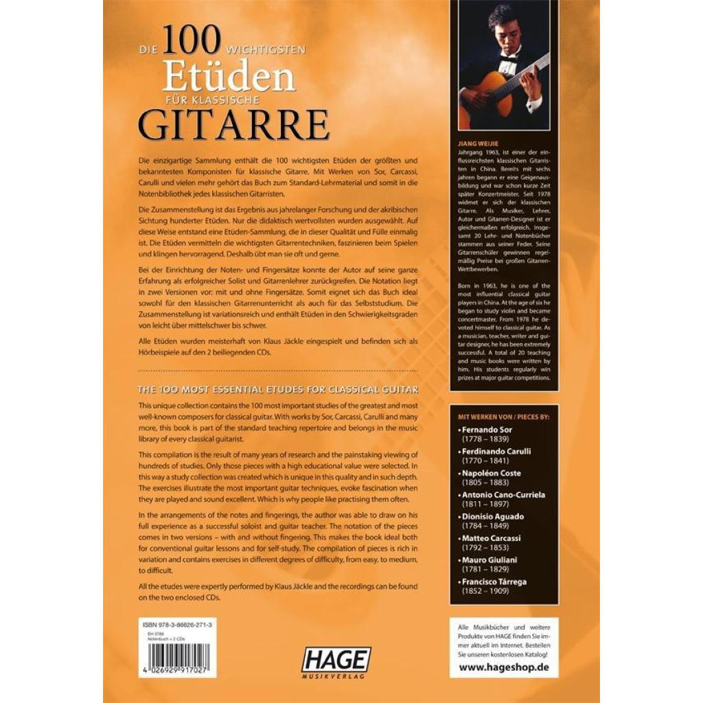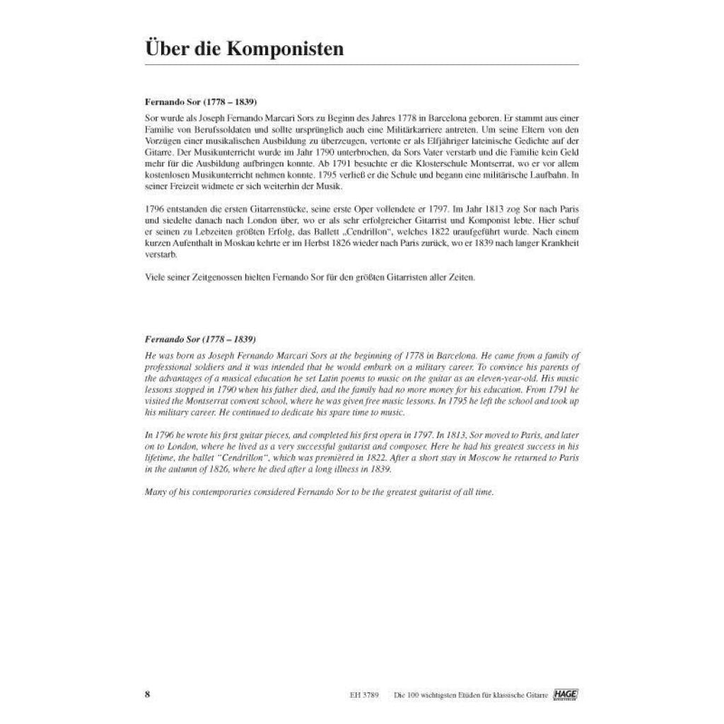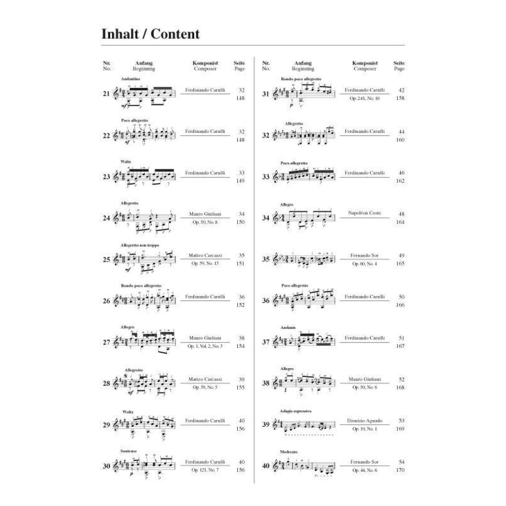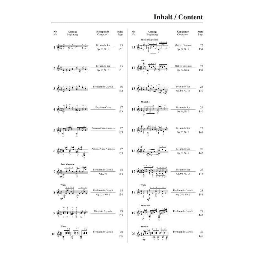 Diese einzigartige Sammlung enthält die 100 wichtigsten Etüden der größten und bekanntesten Komponisten für klassische Gitarre. Mit Werken von Sor, Carcassi, Carulli und vielen mehr gehört das Buch zum Standard-Lehrmaterial und somit in die Notenbibliothek jedes klassischen Gitarristen. Die Zusammenstellung ist das Ergebnis aus jahrelanger Forschung und der akribischen Sichtung hunderter Etüden. Nur die didaktisch wertvollsten wurden ausgewählt. Auf diese Weise entstand eine Etüden-Sammlung, die in dieser Qualität und Fülle einmalig ist. Die Etüden vermitteln die wichtigsten Gitarrentechniken, faszinieren beim Spielen und klingen hervorragend. Deshalb übt man sie oft und gerne. Bei der Einrichtung der Noten- und Fingersätze konnte der Autor auf seine ganze Erfahrung als erfolgreicher Solist und Gitarrenlehrer zurückgreifen. Die Notation liegt in zwei Versionen vor: mit und ohne Fingersätze. Somit eignet sich das Buch ideal sowohl für den klassischen Gitarrenunterricht als auch für das Selbststudium. Die Zusammenstellung ist variationsreich und enthält Etüden in den Schwierigkeitsgraden von leicht über mittelschwer bis schwer. Alle 100 Etüden wurden meisterhaft von Klaus Jäckle eingespielt und können als Hörbeispiel über den jeweiligen QR-Code einfach mit dem Smartphone oder Tablet abgespielt werden. --------------------------- This unique collection contains the 100 most important studies of the greatest and most well-known composers for classical guitar. With works by Sor, Carcassi, Carulli and many more, this book is part of the standard teaching repertoire and belongs in the music library of every classical guitarist. This compilation is the result of many years of research and the painstaking viewing of hundreds of studies. Only those pieces with a high educational value were selected. In this way a study collection was created which is unique in this quality and in such depth. The exercises illustrate the most important guitar techniques, evoke fascination when they are played and sound excellent. Which is why people like practising them often. In the arrangements of the notes and fingerings, the author was able to draw on his full experience as a successful soloist and guitar teacher. The notation of the pieces comes in two versions - with and without fingering. This makes the book ideal both for conventional guitar lessons and for self-study. The compilation of pieces is rich in variation and contains exercises in different degrees of difficulty, from easy, to medium, to difficult. All 100 etudes were expertly performed by Klaus Jäckle and can be easily played as an audio sample with a smartphone or tablet via the corresponding QR code.