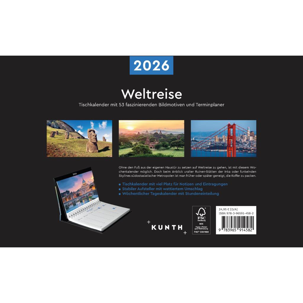 | Keyword: | Bildkalender 2026; Fotokalender 2026; Globetrotter; Kalender; Kalender 2026; Kulturhighlights; Landschaftsfotografie; Metropolen; Naturfotografie; Stadtansichten; Terminplaner 2026; Tischkalender 2026; Weltenbummler; Weltreise; Wochenplaner 2026 |