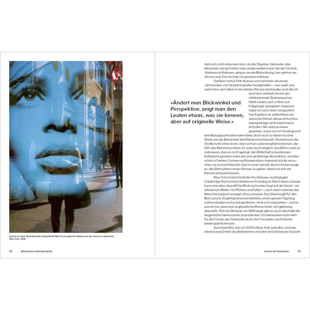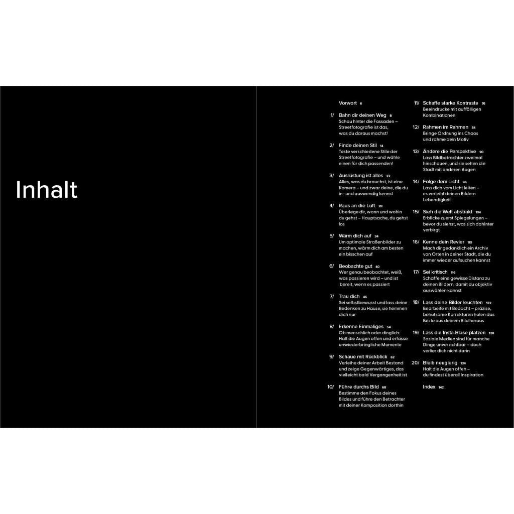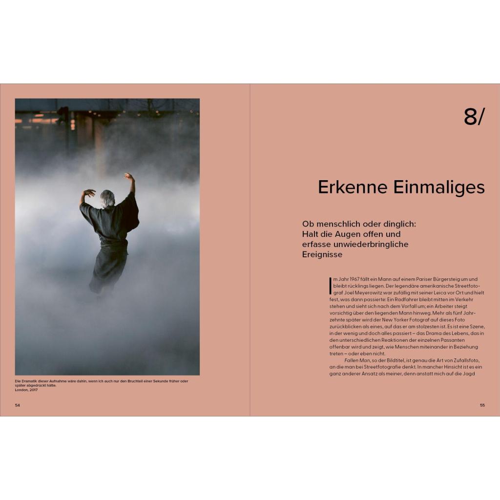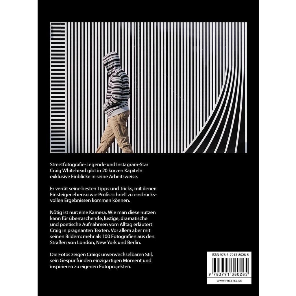 Ein Meisterklasse-Kurs mit dem Experten In 20 kurzen Kapiteln gibt der britische Streetfotografie-Star Craig Whitehead exklusive Einblicke in seine Arbeitsweise. Er verrät Tipps und Tricks, mit denen auch Ungeübte schnell zu eindrucksvollen Ergebnissen kommen können. Nötig ist eigentlich nur eins: eine Kamera. Wie man diese nutzen kann für überraschende, lustige, dramatische und poetische Aufnahmen vom Alltag erläutert der Autor in knappen und prägnanten Texten. Vor allem aber mit seinen Bildern: mehr als 100 Fotografien aus den Straßen von London, New York oder Berlin und Cambridge , seiner Heimatstadt. Die Fotos zeigen Craigs unverwechselbaren Stil, seinen britischen Humor, sein Gespür für den einzigartigen Moment und inspirieren zu eigenen Fotoprojekten .
