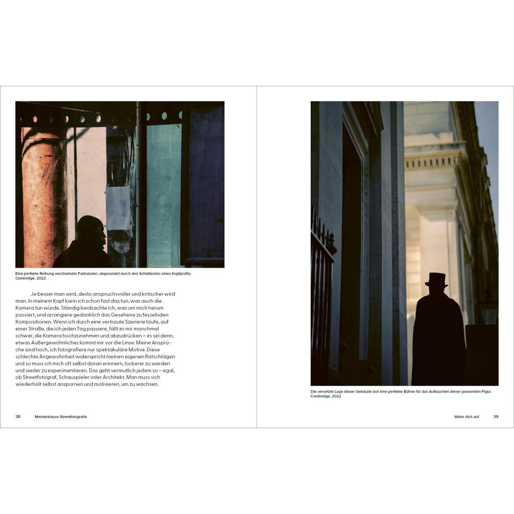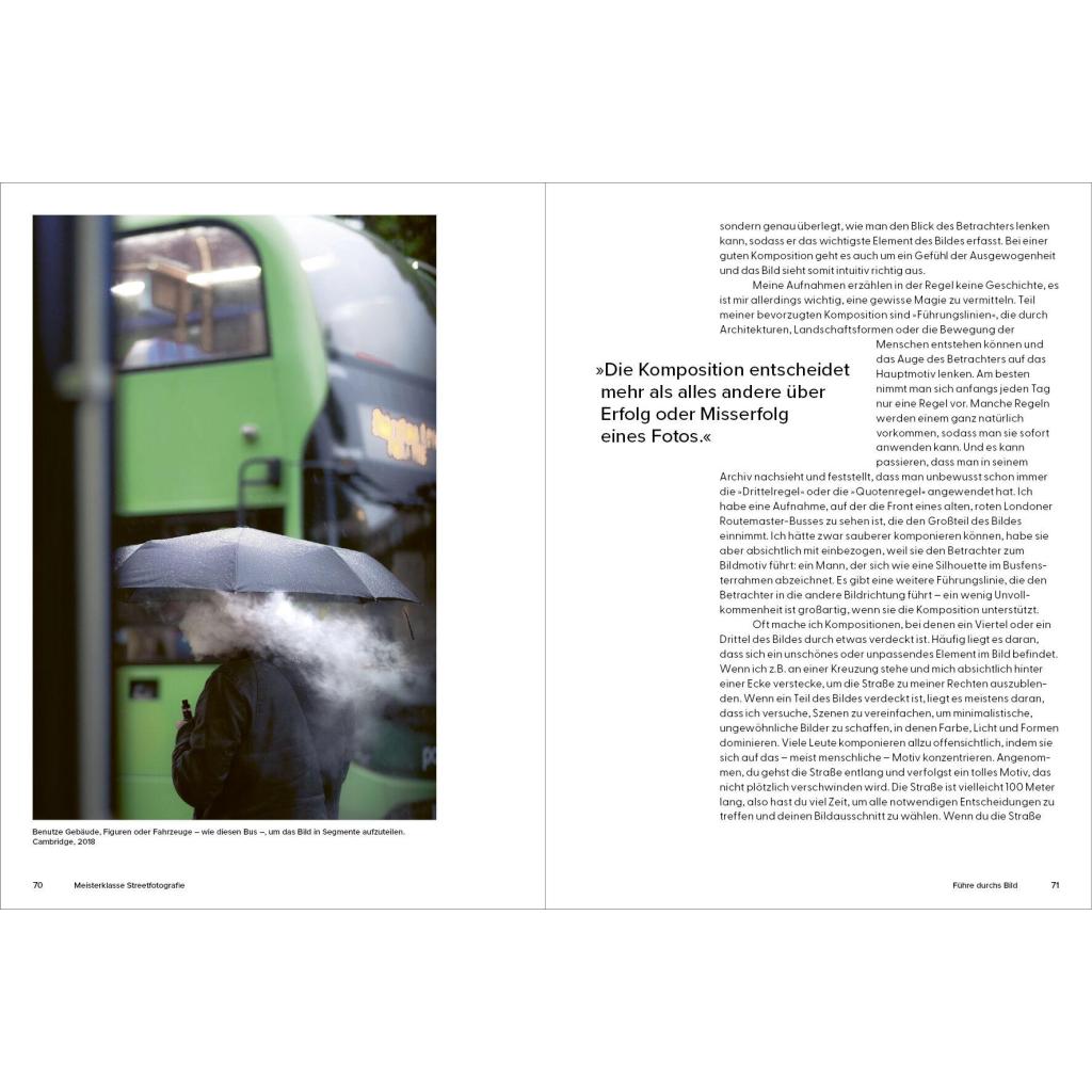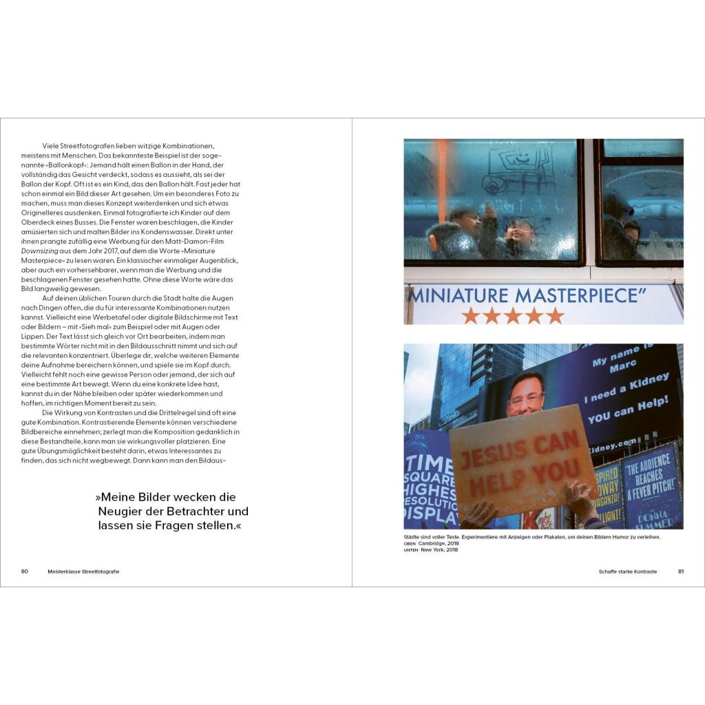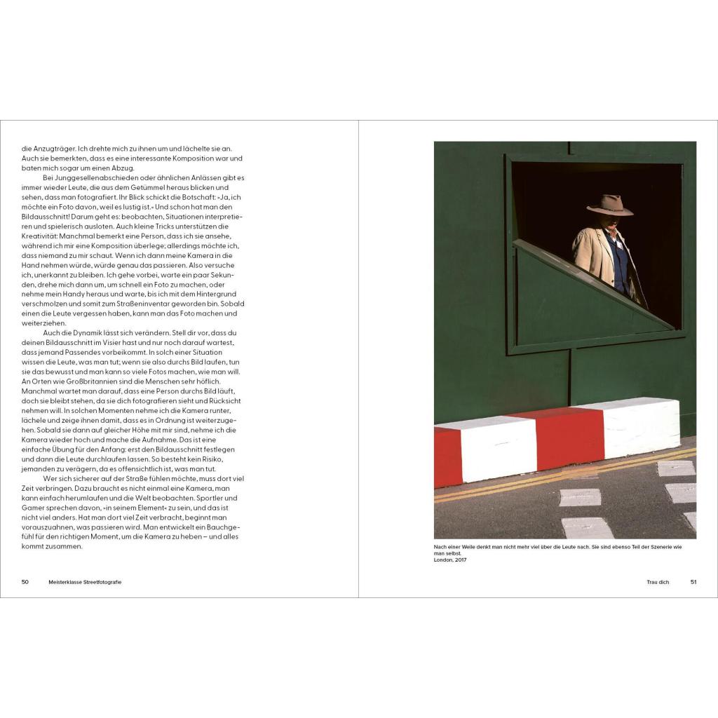 Ein Meisterklasse-Kurs mit dem Experten In 20 kurzen Kapiteln gibt der britische Streetfotografie-Star Craig Whitehead exklusive Einblicke in seine Arbeitsweise. Er verrät Tipps und Tricks, mit denen auch Ungeübte schnell zu eindrucksvollen Ergebnissen kommen können. Nötig ist eigentlich nur eins: eine Kamera. Wie man diese nutzen kann für überraschende, lustige, dramatische und poetische Aufnahmen vom Alltag erläutert der Autor in knappen und prägnanten Texten. Vor allem aber mit seinen Bildern: mehr als 100 Fotografien aus den Straßen von London, New York oder Berlin und Cambridge , seiner Heimatstadt. Die Fotos zeigen Craigs unverwechselbaren Stil, seinen britischen Humor, sein Gespür für den einzigartigen Moment und inspirieren zu eigenen Fotoprojekten .