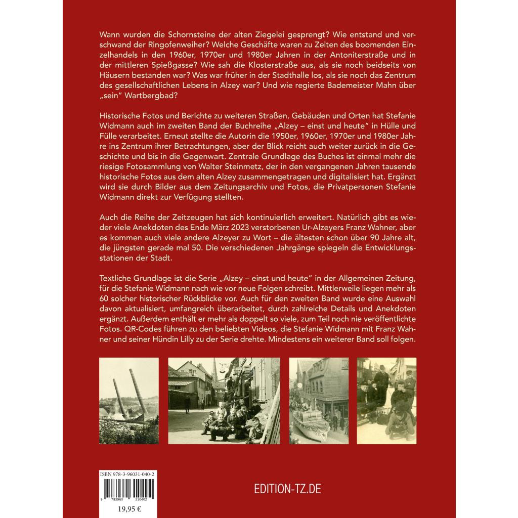 Wann wurden die Schornsteine der alten Ziegelei gesprengt? Wie entstand und verschwand der Ringofenweiher? Welche Geschäfte waren zu Zeiten des boomenden Einzelhandels in den 1960er, 1970er und 1980er Jahren in der Antoniterstraße und in der mittleren Spießgasse? Wie sah die Klosterstraße aus, als sie noch beidseits von Häusern bestanden war? Was war früher in der Stadthalle los, als sie noch das Zentrum des gesellschaftlichen Lebens in Alzey war? Und wie regierte der Bademeister Mahn über "sein" Wartbergbad? Historische Fotos und Berichte zu weiteren Straßen, Gebäuden und Orten hat Stefanie Widmann auch im zweiten Band der Buchreihe "Alzey - einst und heute" in Hülle und Fülle verarbeitet. Grundlage ist die Serie in der Allgemeinen Zeitung, für die Stefanie Widmann nach wie vor neue Folgen schreibt. Mittlerweile liegen mehr als 60 solcher historischer Rückblicke vor. Auch für den zweiten Band wurde eine Auswahl davon aktualisiert, umfangreich überarbeitet, durch zahlreiche Details und Anekdoten ergänzt. Mindestens ein weiterer Band soll folgen.