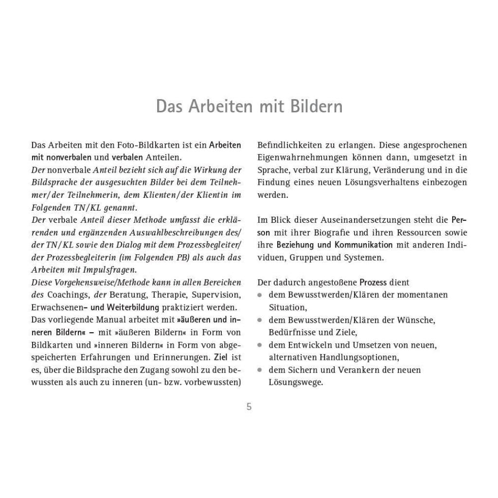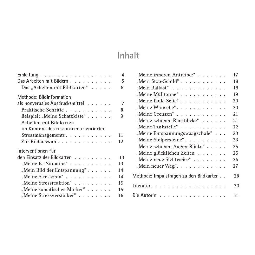 Wirksames Stressmanagement Stress ist ein hochaktuelles Thema im Rahmen von Coaching, Beratung und Therapie. Das Arbeiten mit Foto-Bildkarten bietet hier effektive und entspannte Methoden im ressourcenorientierten Stressmanagement. Durch die individuelle Auswahl der Bildkarten wird ein Prozess der Wahrnehmung, Klärung und Veränderung aktiviert und so das Prozessgeschehen der Stressbewältigung angestoßen: effektiv, lösungsfördernd und ressourcenorientiert! Die methodischen Grundlagen sind in der beiliegenden Broschüre schnell nachzulesen, sodass die Bildkarten direkt einsatzbereit sind.