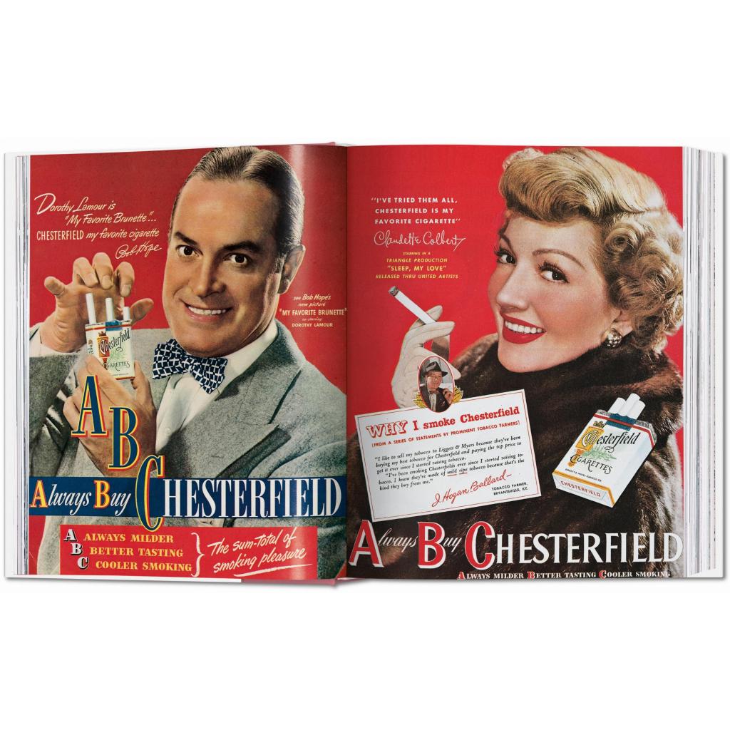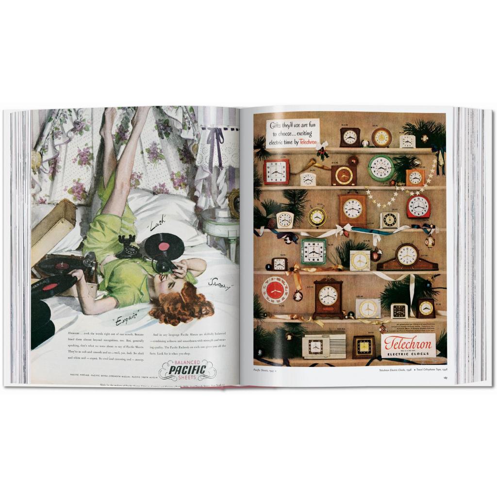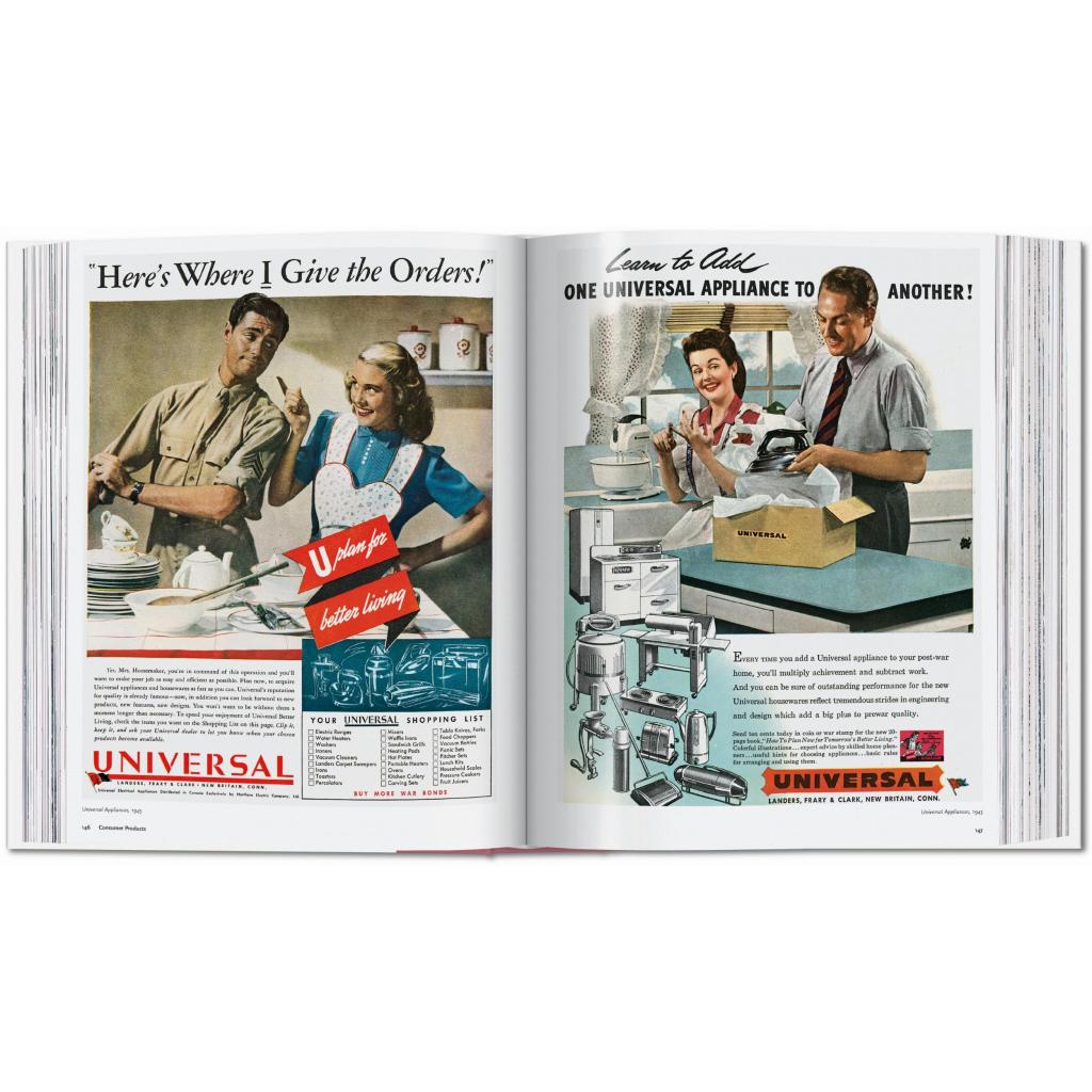 Zu Beginn des Jahrzehnts traten die USA in den Krieg ein. Patriotismus wurde folglich zum festen Bestandteil des Alltags und spiegelte sich somit auch in der Werbung wider. Als das Land 1945 siegreich aus den düsteren Jahren des Zweiten Weltkriegs heraustrat, ging der eintretende Wirtschaftsboom mit einem drastischen Anstieg der Lebensqualität, dem Konsum bis hin zum Exzess einher. Der Kriegsausgang löste bei den Amerikanern einen beispiellosen Nationalstolz und Wohlstand aus, und nirgendwo zeigte sich diese neue Welle des Fortschritts- und Konsumdenkens besser als in der zeitgenössischen Reklame. In der zweiten Hälfte des Jahrzehnts schnellte die Kaufkraft dank freier Stellen und steigender Löhne sprunghaft nach oben. Die neue G.I. Bill ermöglichte heimkehrenden Kriegsveteranen erstmals den Erwerb von Wohneigentum und die Menschen fanden den Glauben an den amerikanischen Traum wieder . In der Nachkriegszeit wurde der Markt bis in die äußersten Winkel der Gesellschaft von Produkten und Dienstleistungen für jeden Zweck und zu jedem Anlass überschwemmt. Alles - von Unterhaltung über Reisen und Autos, Alkohol und Tabak, Mode und Kosmetik bis hin zu Lebensmitteln und Getränken - war sowohl gefragt als auch erschwinglich. Diese Ära öffnete dem Kaufrausch Tür und Tor, während Werbetreibende versuchten, die Bedürfnisse einer Bevölkerung zu stillen, die sich von Jahren der Rationierung erholte . Diese faszinierende Sammlung, herausgegeben von Jim Heimann, taucht ein in die quirlige, muntere und beschwingte Epoche des Lebens und Werbens im Amerika der 1940er Jahre .