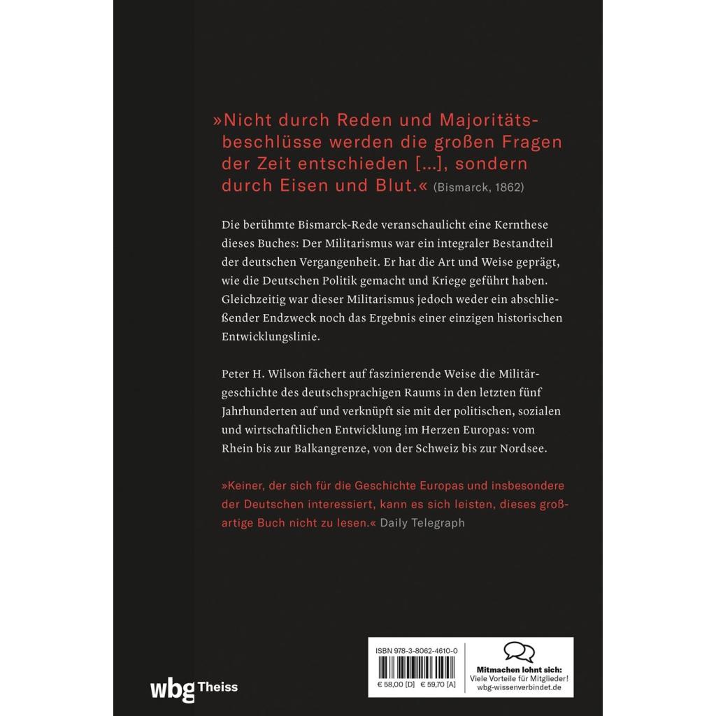 Vom kriegerischen Herzen Europas: eine faszinierende Analyse Welchen Einfluss hatte der Militarismus auf die deutsche Geschichte der Neuzeit? Peter H. Wilson fächert in beeindruckender Weise die gesamte Militärgeschichte des deutschsprachigen Raumes der letzten fünf Jahrhunderte auf. Dabei berücksichtigt er nicht nur alle militärischen Aspekte von der Waffenentwicklung bis hin zur Kriegsstrategie, sondern auch Politik, Wirtschaft, Technologie, gesellschaftliche Entwicklungen und die Folgen der Kriege. - Nuanciert und komplex: ein neuer Blick auf die Geschichte Europas - Vom römischen-deutschen Reich zum Nationalstaat: 500 Jahre Militärgeschichte - Die Entwicklung der Kriegsführung an Land, zur See und in der Luft - Kriege, Feldzüge, Generäle und der Militarismus: eine scharfe Analyse für Geschichtsinteressierte - Vom Historiker und Autor des gefeierten Sachbuchs "Der Dreißigjährige Krieg" Wie das Militärische die deutsche Geschichte bestimmt Bismarcks berühmte Rede "Blut und Eisen" zeigt, wie sehr der Militarismus ein integraler Bestandteil der deutschen Geschichte ist. Er prägte die Art und Weise, wie Politik gemacht und Kriege geführt wurden - und das nicht erst seit der Entstehung des deutschen Nationalstaates. Deshalb greift die in vielen Büchern zu Militär und Geschichte gepflegte Verengung des Blicks auf Aufstieg und Fall Preußens und die Zeit von 1914 bis 1945 zu kurz. Peter H. Wilson zeigt in seinem monumentalen Werk, wie wichtig es ist, die deutsche Militärgeschichte in einen größeren Zusammenhang zu stellen.