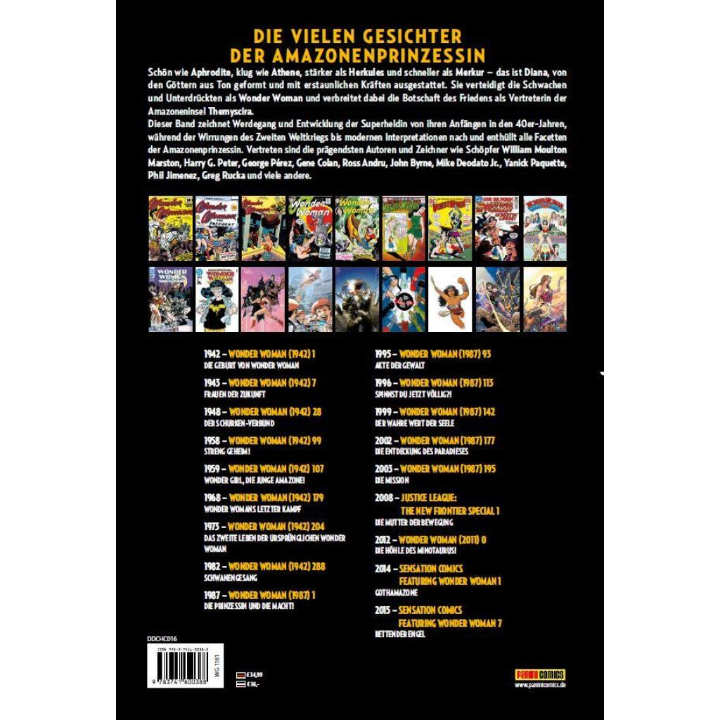 DIE VIELEN GESICHTER DER AMAZONENPRINZESSIN Schön wie Aphrodite, klug wie Athene, stärker als Herkules und schneller als Merkur - das ist Diana, von den Göttern aus Ton geformt und mit erstaunlichen Kräften ausgestattet. Sie verteidigt die Schwachen und Unterdrückten als Wonder Woman und verbreitet dabei die Botschaft des Friedens als Vertreterin der Amazoneninsel Themyscira. Dieser Band zeichnet Werdegang und Entwicklung der Superheldin von ihren Anfängen in den 40er-Jahren, während der Wirrungen des Zweiten Weltkriegs bis modernen Interpretationen nach und enthüllt alle Facetten der Amazonenprinzessin. Vertreten sind die prägendsten Autoren und Zeichner wie Schöpfer William Moulton Marston, Harry G. Peter, George Pérez, Gene Colan, Ross Andru, John Byrne, Mike Deodato Jr., Yanick Paquette, Phil Jimenez, Greg Rucka und viele andere.