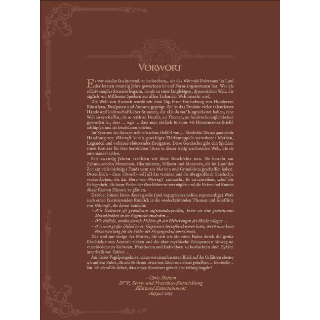 Reisen Sie durch ein Zeitalter voller Mythen und Legenden, lange vor der Entstehung von Horde und Allianz. Dieses umfangreiche Werk über die Warcraft-Historie präsentiert zahlreiche bislang unerzählte Geschichten über die Geburt des Kosmos, über den Aufstieg uralter Imperien und die Mächte, die die Welt Azeroth und ihre Bevölkerung zu dem gemacht haben, was sie heute sind. Wunderschön illustriert mit Original-Artworks und detaillierten Karten, ist dieser Band der World of Warcraft-Choniken das erste Buch einer mehrteiligen Serie, die die phantastischen Fabeln und Sagen des Warcraft-Universums eingehend beleuchtet, von der fernen Vergangenheit bis hinein in die Moderne.