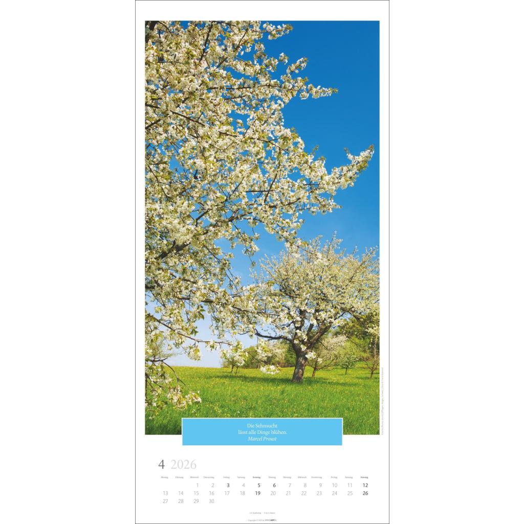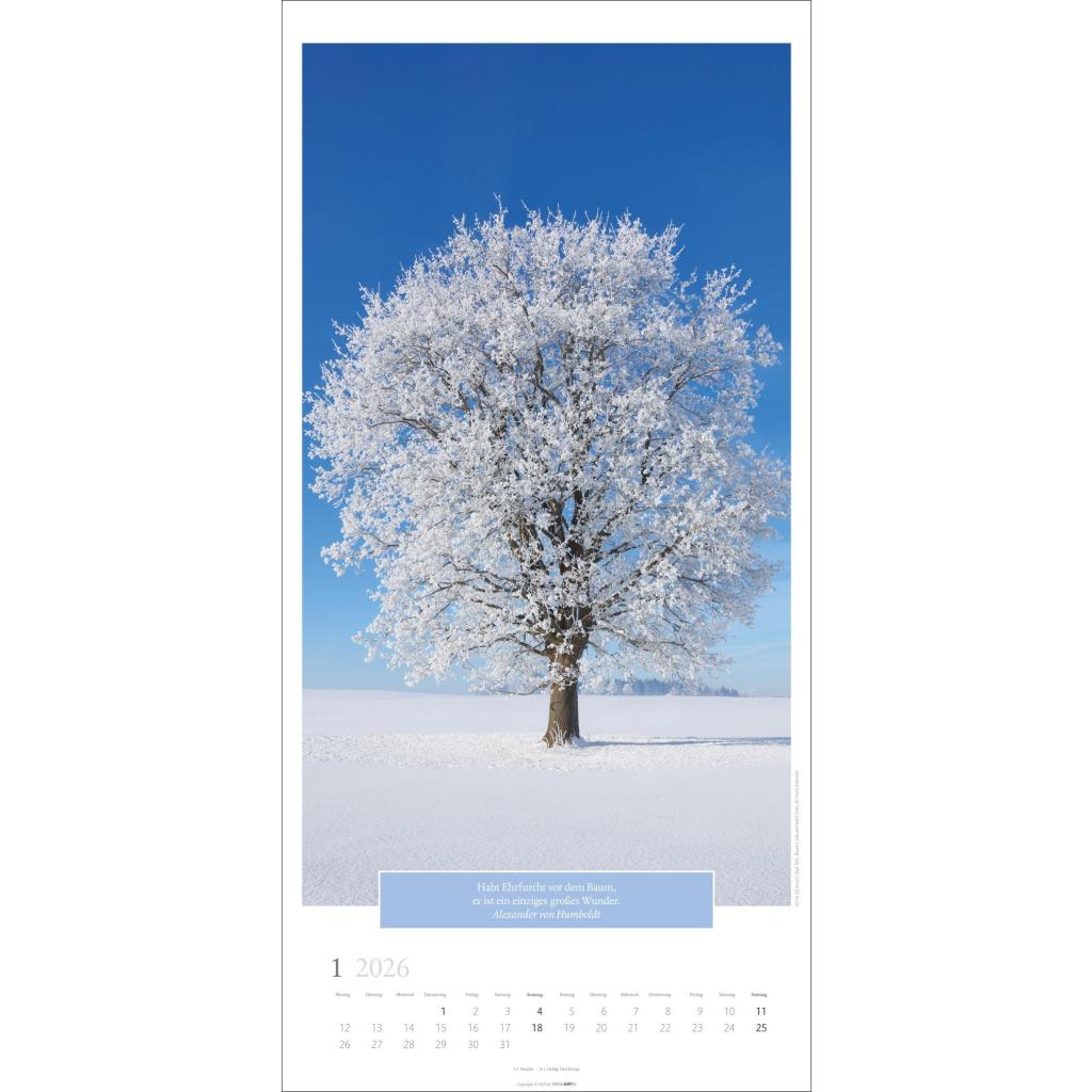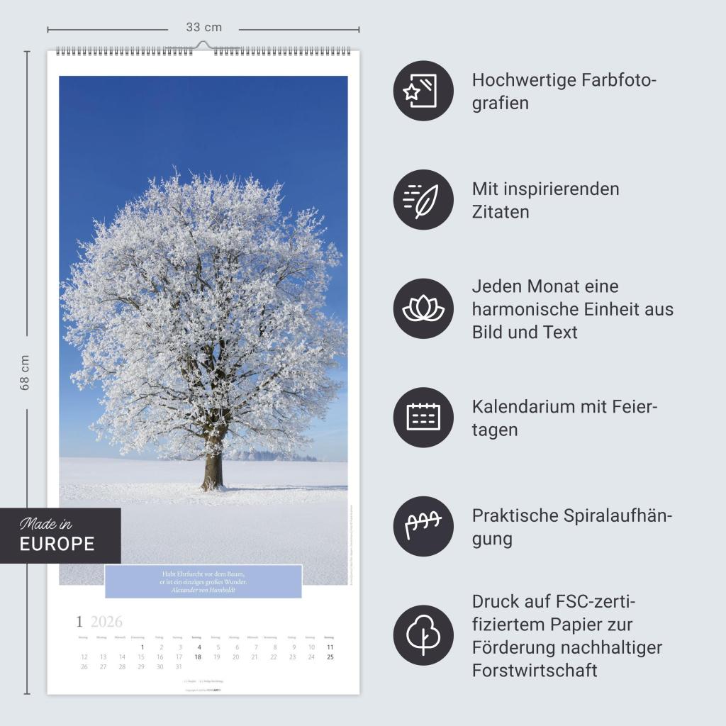 Baum-Fotos durch alle Jahreszeiten in einem länglichen Kalender im Format 33x68 cm. Jahres-Wandkalender mit Fotos von der Blüte bis zum kahlen Winter.