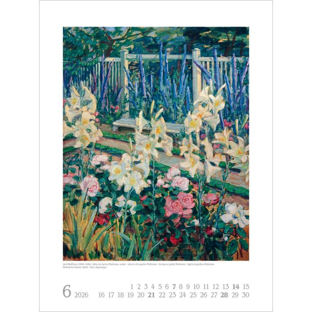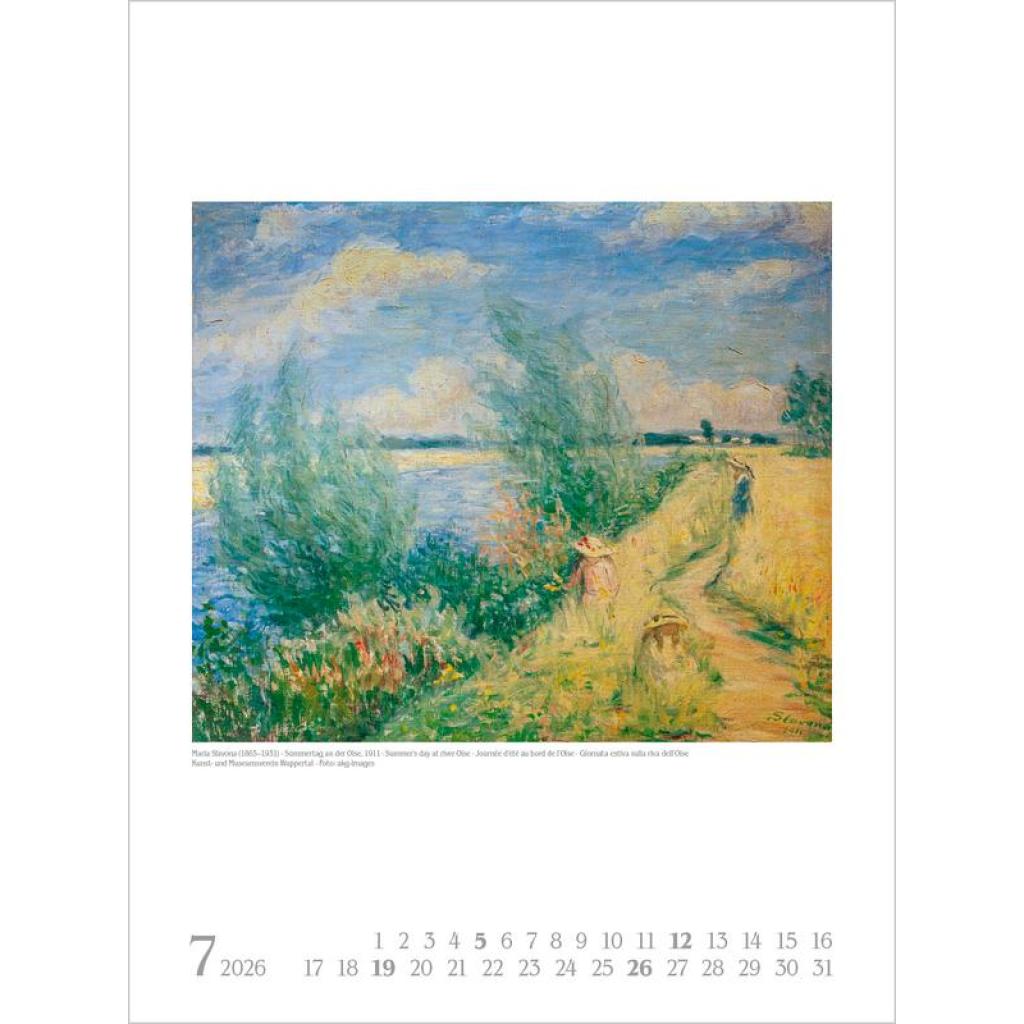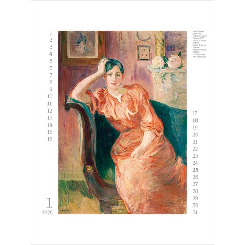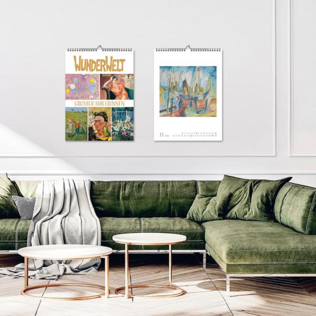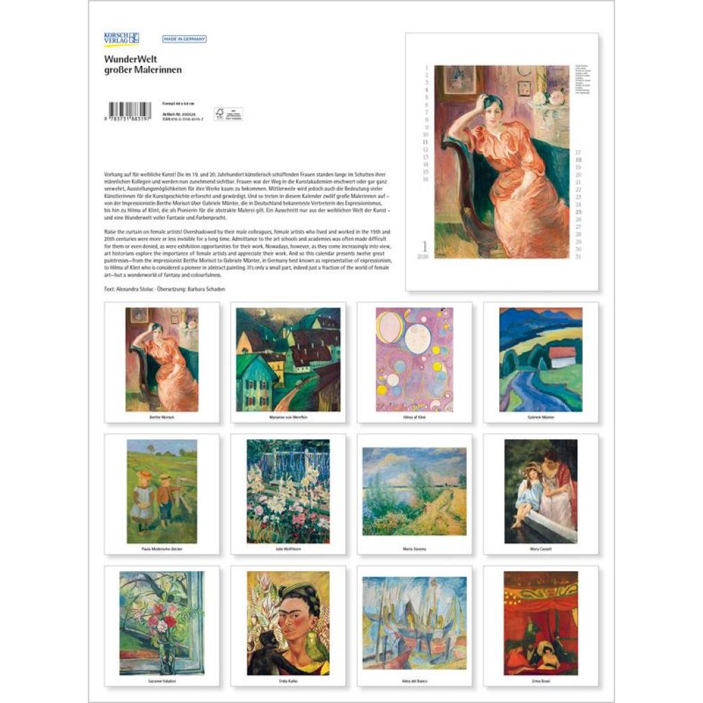 Vorhang auf für weibliche Kunst! Im 19. und 20. Jahrhundert künstlerisch schaffende Frauen standen lange im Schattenihrer männlichen Kollegen und werden nun zunehmend sichtbar und gewürdigt. Und so treten in diesem Kalender zwölf große Malerinnen auf - von der Impressionistin Berthe Morisot über Gabriele Münter, die in Deutschland bekannteste Vertreterin des Expressionismus, bis hin zu Hilma af Klint, die als Pionierin für abstrakte Malerei gilt.Ein Ausschnitt nur aus der weiblichen Welt der Kunst -und eine Wunderwelt voller Fantasie und Farbenpracht. Produkthighlights Kunstkalender groß im Hochformat Hervorragende Druckqualität bis ins Detail; Mit speziellem Golddruck! Neutrales Kalendarium für alle Länder FSC zertifiziertes Papier aus verantwortungsvollen Quellen Schickes passepartout Design für einen wertigen Anblick Ihres Wandkalenders Korsch Wandkalender Entdecke die vielseitigen Einsatzmöglichkeiten für unseren Kalender, sei es im Büro, in der Küche, im Wohn- oder Schlafzimmer. Dieser Wandkalender ist nicht nur ein optisches Highlight, sondern auch ein praktischer Begleiter durch das Jahr. Er begeistert mit wechselnden, einzigartigen Motiven für jede Jahreszeit. Korsch Kalender zeichnen sich durch eine herausragende Druckqualität, eine stabile Spiralbindung und hochwertiges Papier aus. Dies gewährleistet ein müheloses Umblättern der Seiten sowie eine stilvolle Dekoration deiner Räume. Wähle aus verschiedenen Formaten unserer Poster-Kalender aus, um das passende Deko-Element für deine Wand zu finden!