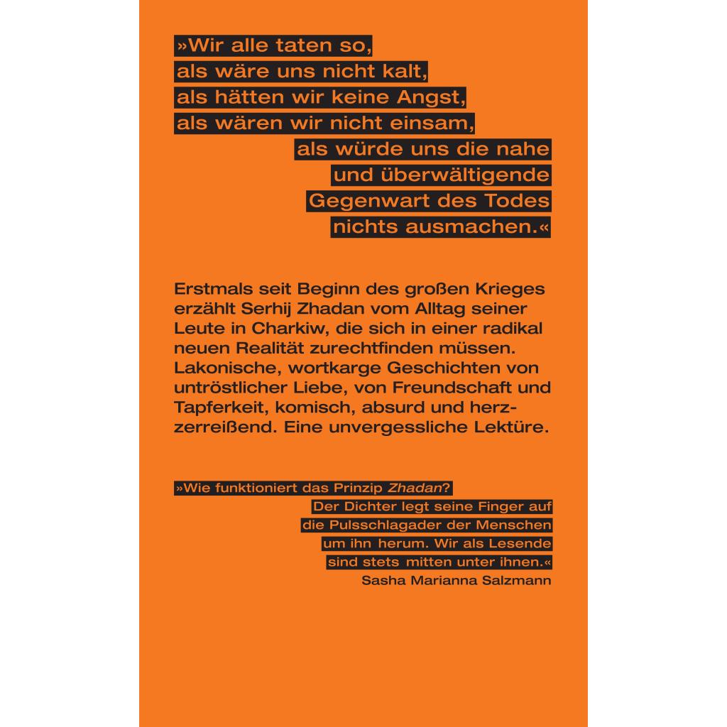 | Keyword: | Alltags-Orte; Angriffskrieg; Arabesky deutsch; Bombardierung; Chronik des eigenen Atems; Die Erfindung des Jazz im Donbass; Evakuierung; Exil; Flucht; Freiheitspreis der Frank-Schirrmacher-Stiftung; Freiheitspreis der Frank-Schirrmacher-Stiftung 2022; Friedenspreis des Deutschen Buchhandels; Friedenspreis des Deutschen Buchhandels 2022; Front; Gesellschaft; Großstadt; Hannah-Arendt-Preis; Hannah-Arendt-Preis für politisches Denken 2022; Himmel über Charkiw; Internat; Invalide; Juri Andruchowytsch; Katja Petrowskaja; Kiew; Krieg; Mesopotamien; Migration; Schutzlosigkeit; Tod; Trauer-Feier; Ukraine; Wohngebiet |